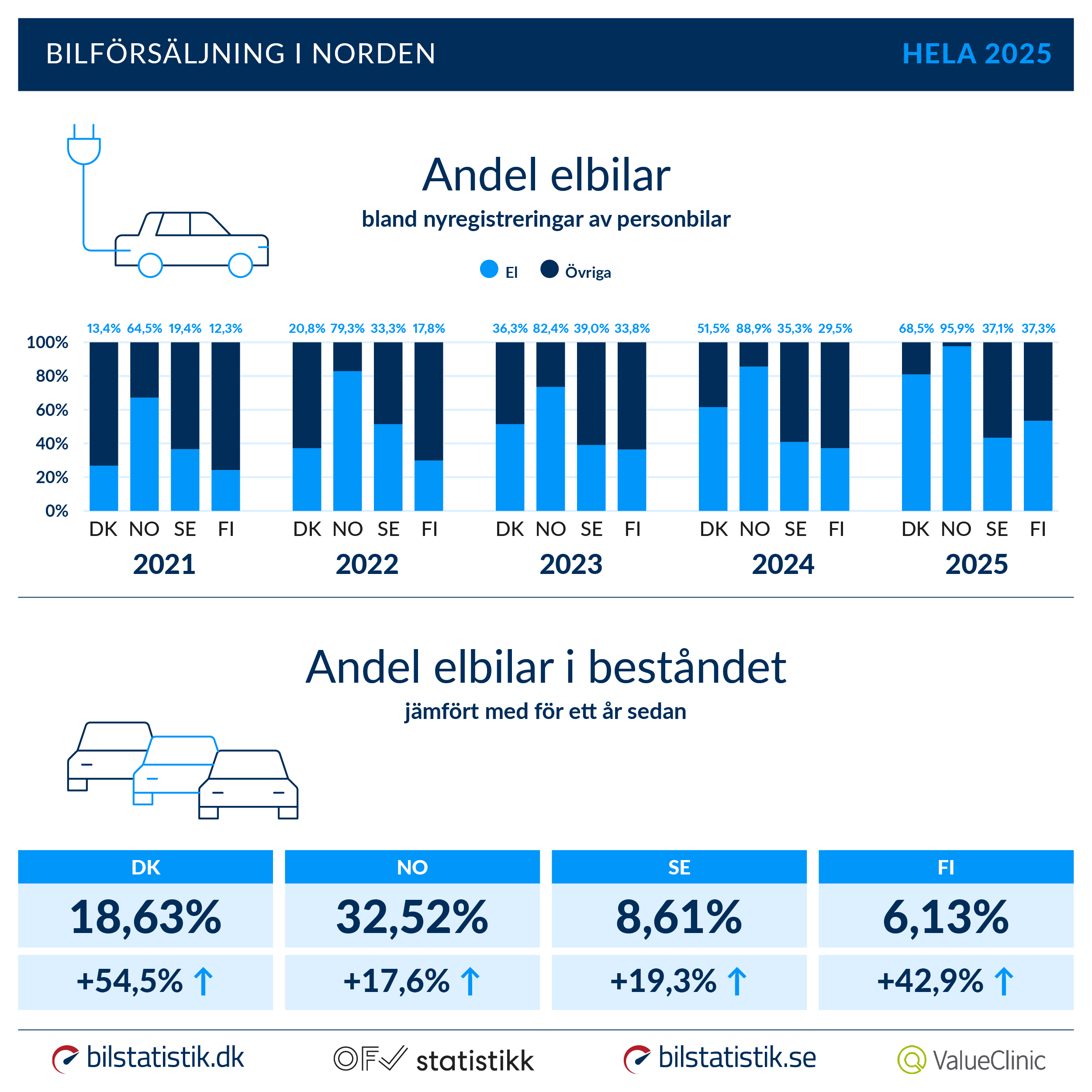 En utveckling som däremot var entydig över samtliga fyra marknader under 2025 var elbilarnas riktning. Andelen elbilar bland nyregistreringarna ökade över hela linjen efter ett 2024 då andelarna minskade både i Sverige och Finland. Det finns dock stora skillnader i hur snabbt omställningen går. Jämfört med helåret 2024 ser utvecklingen ut så här: