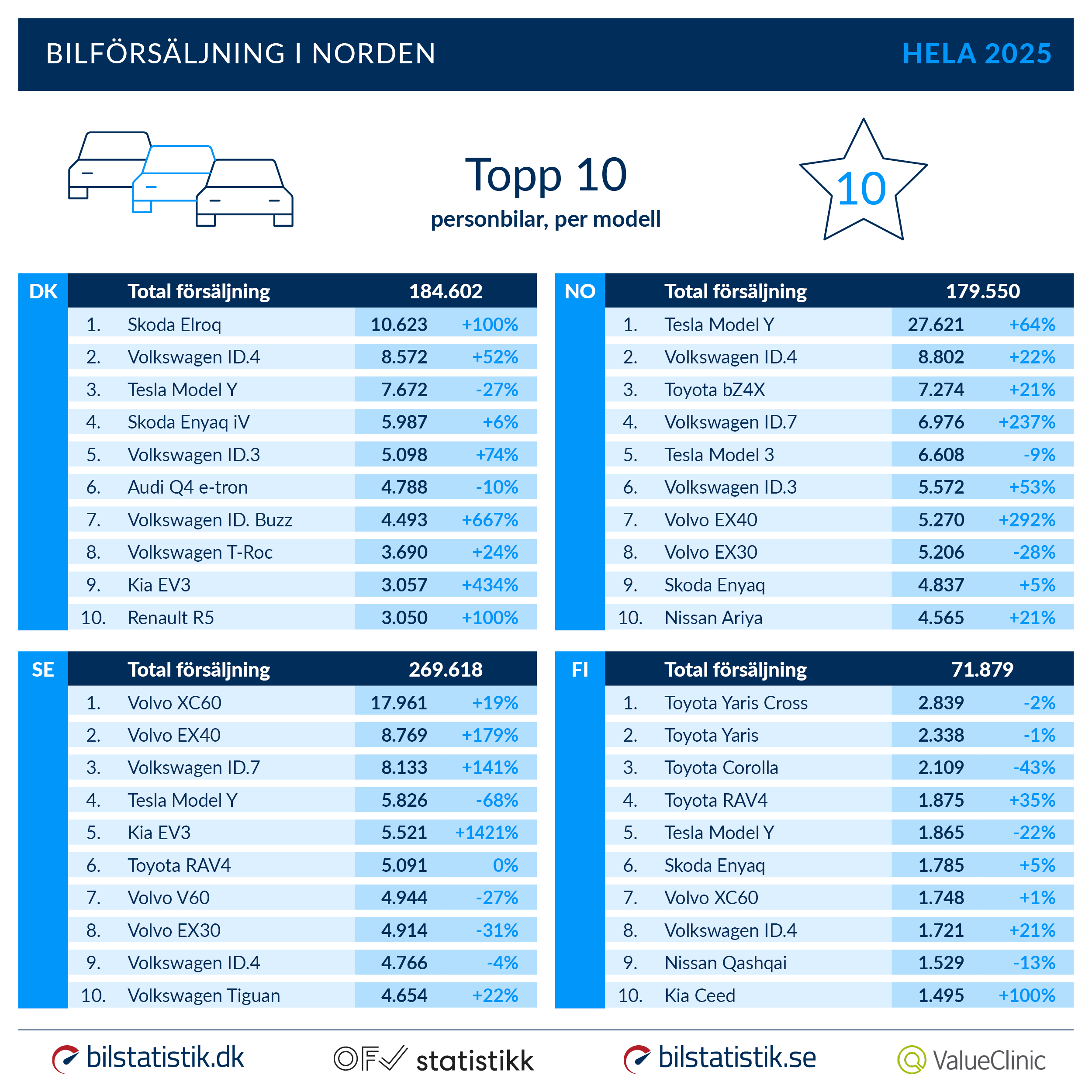 Särskilt i Norge och Sverige fanns det dock helt suveräna vinnare under 2025. I Norge sopade Tesla Model Y banan med all konkurrens med 27 621 nyregistreringar. Det är mer än tre gånger så många bilar som tvåan, Volkswagen ID.4. I Sverige blev det Volvo XC60 som med 17 961 nyregistreringar slog tvåan, Volvo EX40, med mer än 9 000 sålda exemplar. Även om förstaplatsen i Finland inte är lika övertygande som i Norge och Sverige råder det ändå ingen tvekan om var preferenserna ligger. De fyra översta platserna på listan innehas av Toyota.