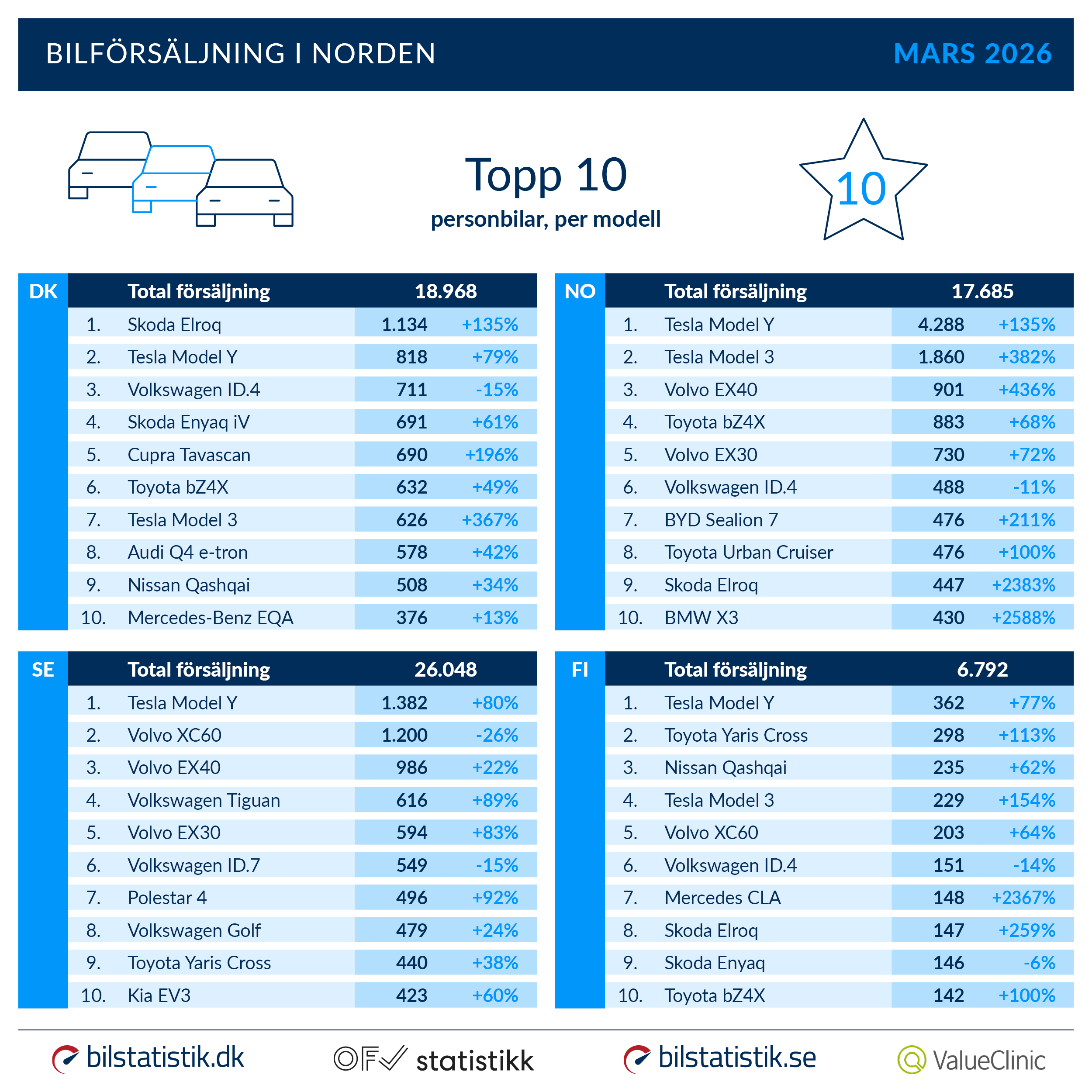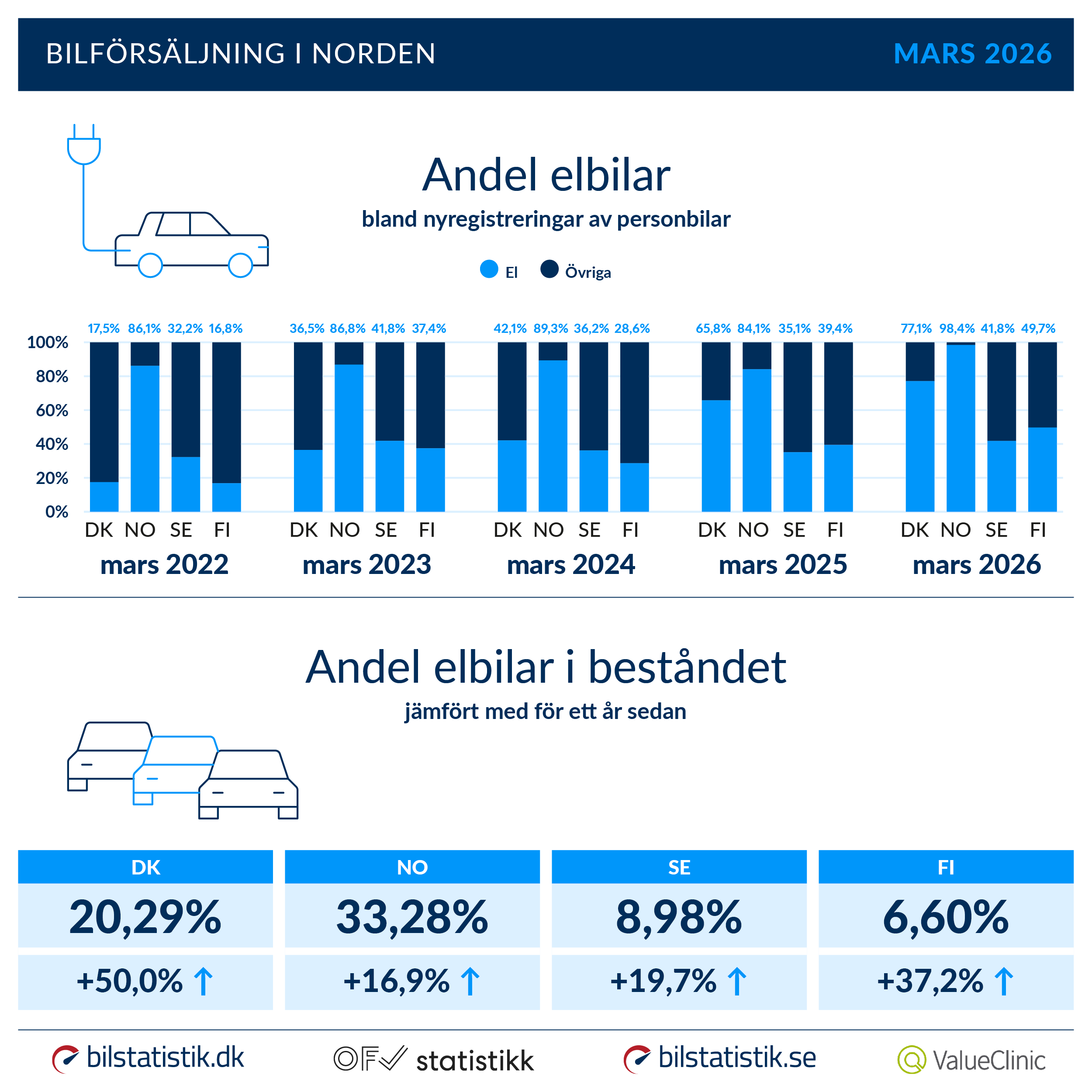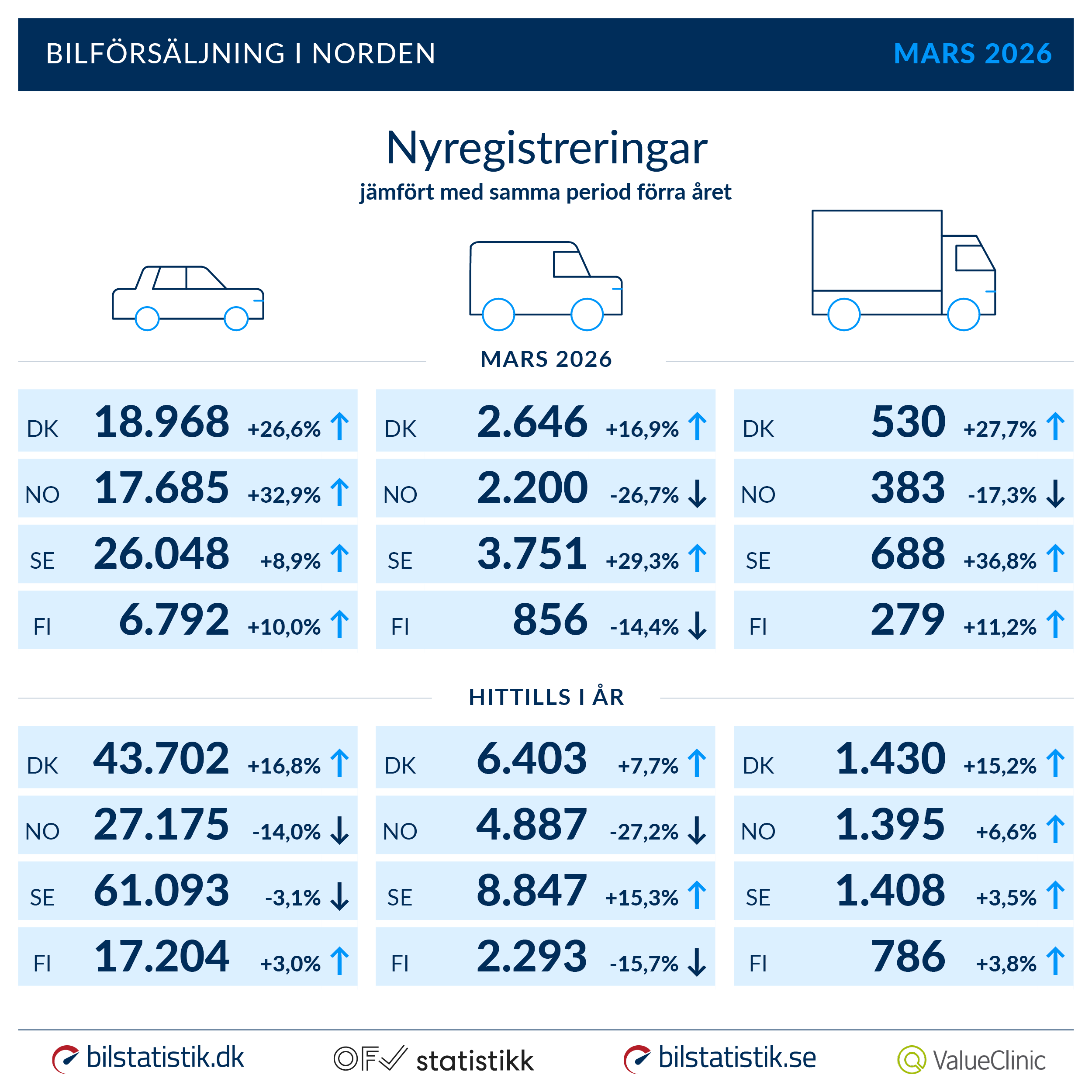 Mars blev en mycket stark månad för personbilsregistreringarna i Norden. Med 17 685 nyregistreringar stod Norge för den största ökningen, med +33 % jämfört med mars 2025. Därefter följer Danmark, där 18 968 nyregistreringar motsvarar en uppgång på knappt 27 %. Även Finland såg en efterlängtad återhämtning efter en längre period med svaga registreringstal. Med 6 792 nyregistreringar slutade mars där på +10 %. I Sverige blev mars också en mycket god månad för bilregistreringarna, med 26 048 nyregistrerade personbilar, vilket är 9 % över nivån i mars 2025.