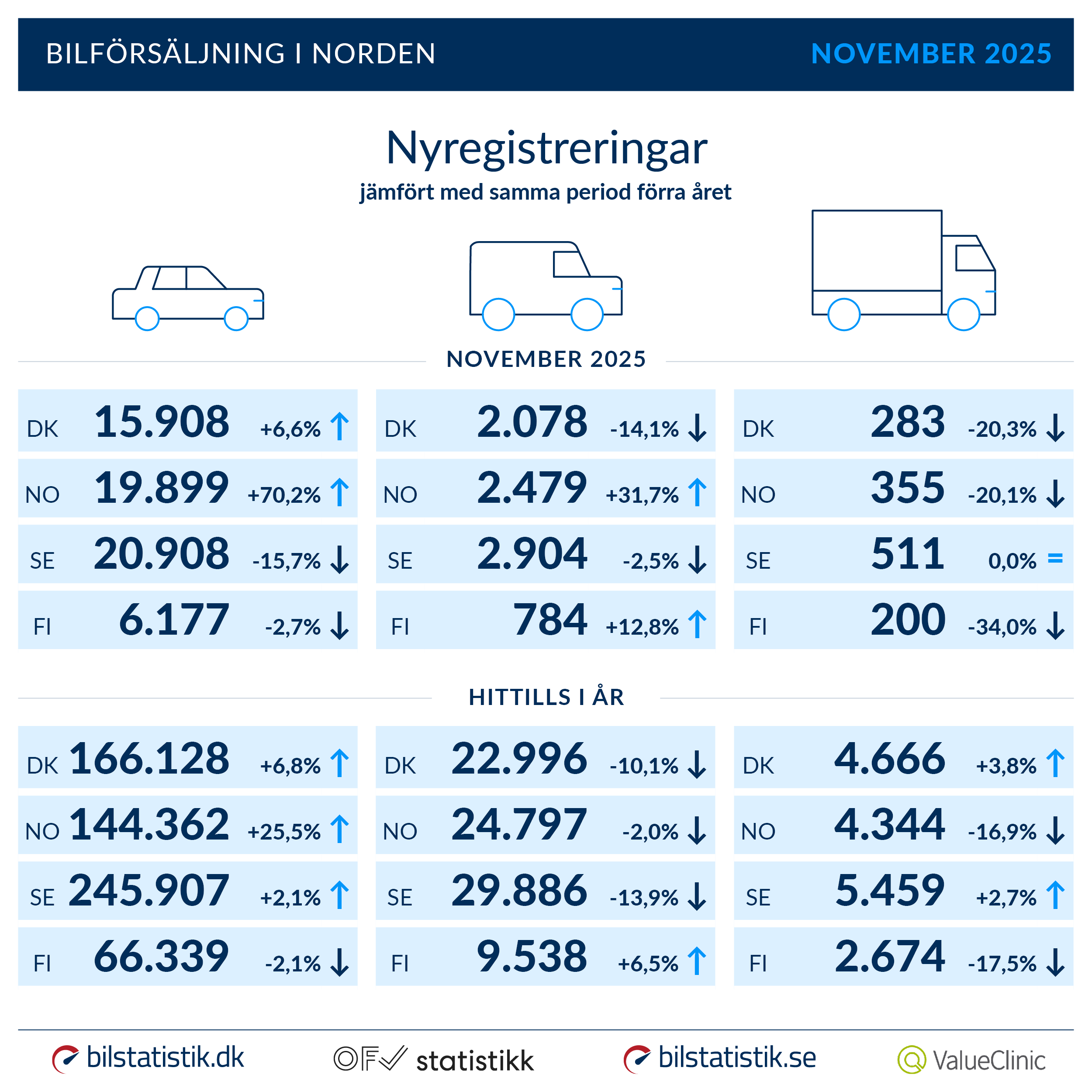 Ser man till årets ackumulerade siffror är det också Norge som drar det längsta strået. Vid utgången av november ligger personbilsregistreringarna 25,5 % över samma period förra året. Danmark följer efter med +6,8 % och Sverige med +2,1 %. Endast Finland får, från en redan mycket låg nivå, nöja sig med en nedgång på 2,1 %.