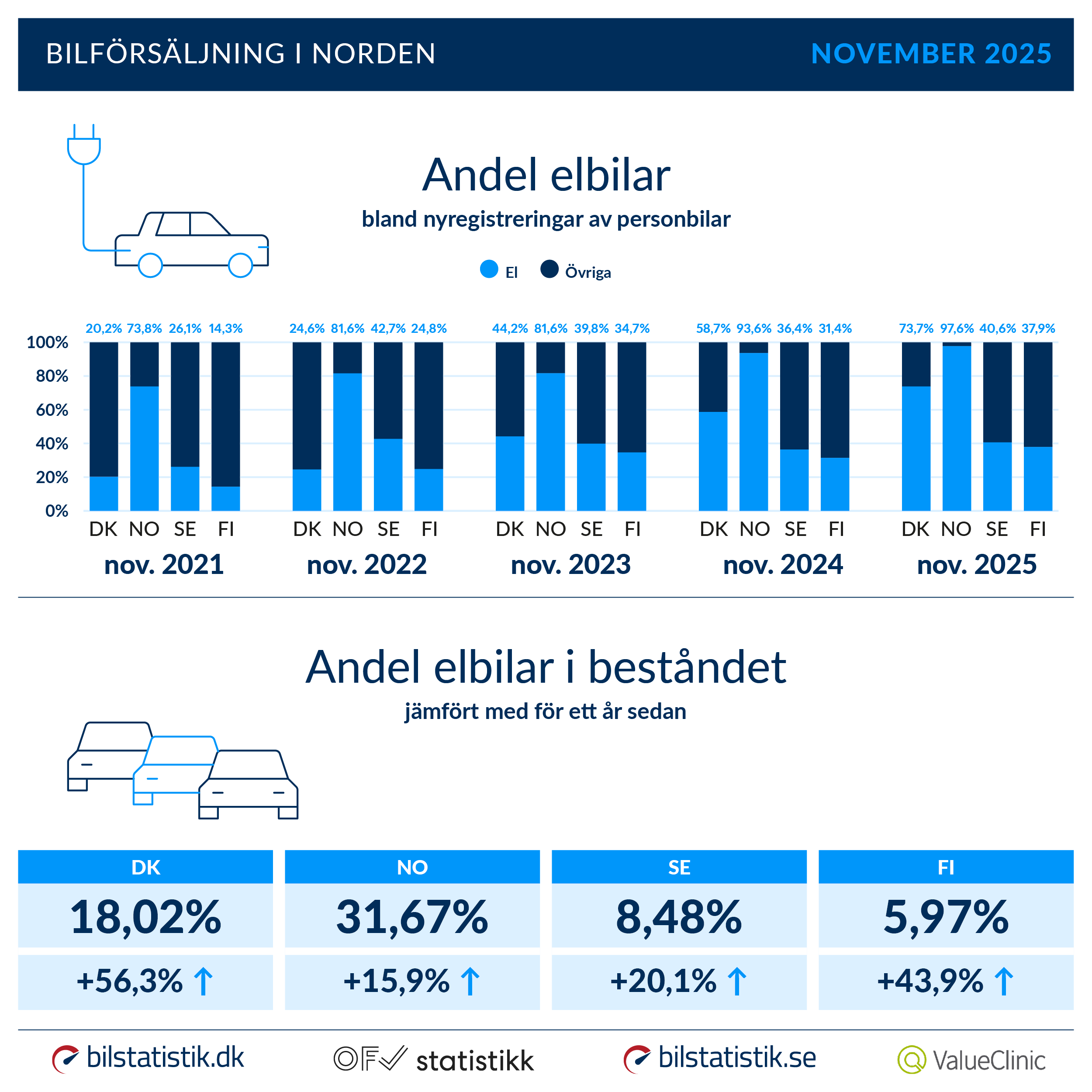 En sak som går igen på alla fyra marknader är de stigande elbilsandelarna i nyförsäljningen och den gröna utvecklingen i bestånden. Norge ligger fortsatt på en mycket hög nivå med 97,6 % av nyregistreringarna, men utvecklingen i Danmark är också klart iögonfallande. Elbilarna stod i november för 73,7 % av nyregistreringarna – en ökning från 58,7 % i november förra året. Finland har gått från 31,4 % till 37,9 % av nyregistreringarna, medan Sverige har ökat sin elbilsandel i nyregistreringarna från 36,4 % till 40,6 %.