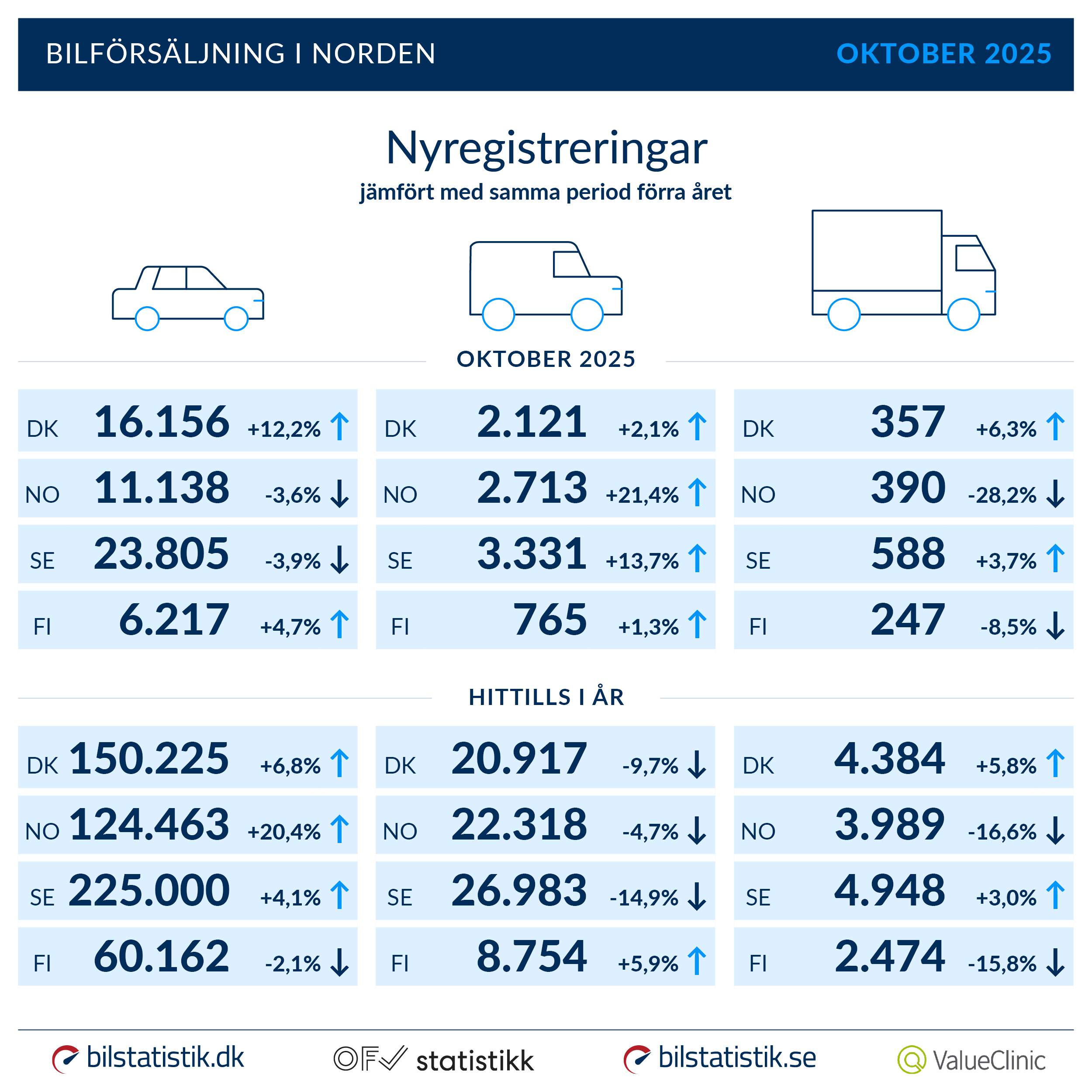 Oktober blev en blandad månad för bilförsäljningen i Norden. Medan Finland och särskilt Danmark upplevde en fin tillväxt för personbilarna gick försäljningen tillbaka i Norge och Sverige. Däremot ökade försäljningen av lätta lastbilar i samtliga länder.
