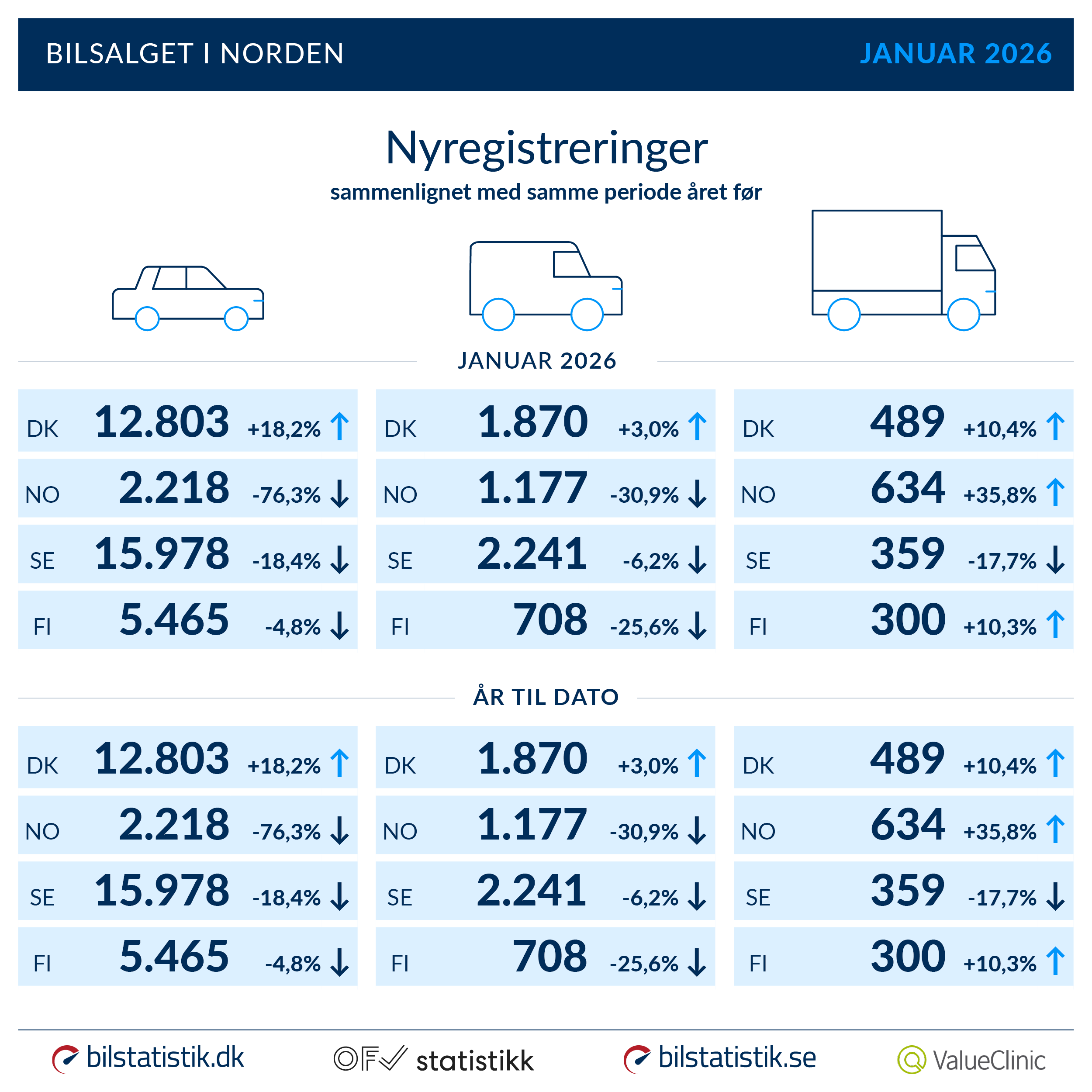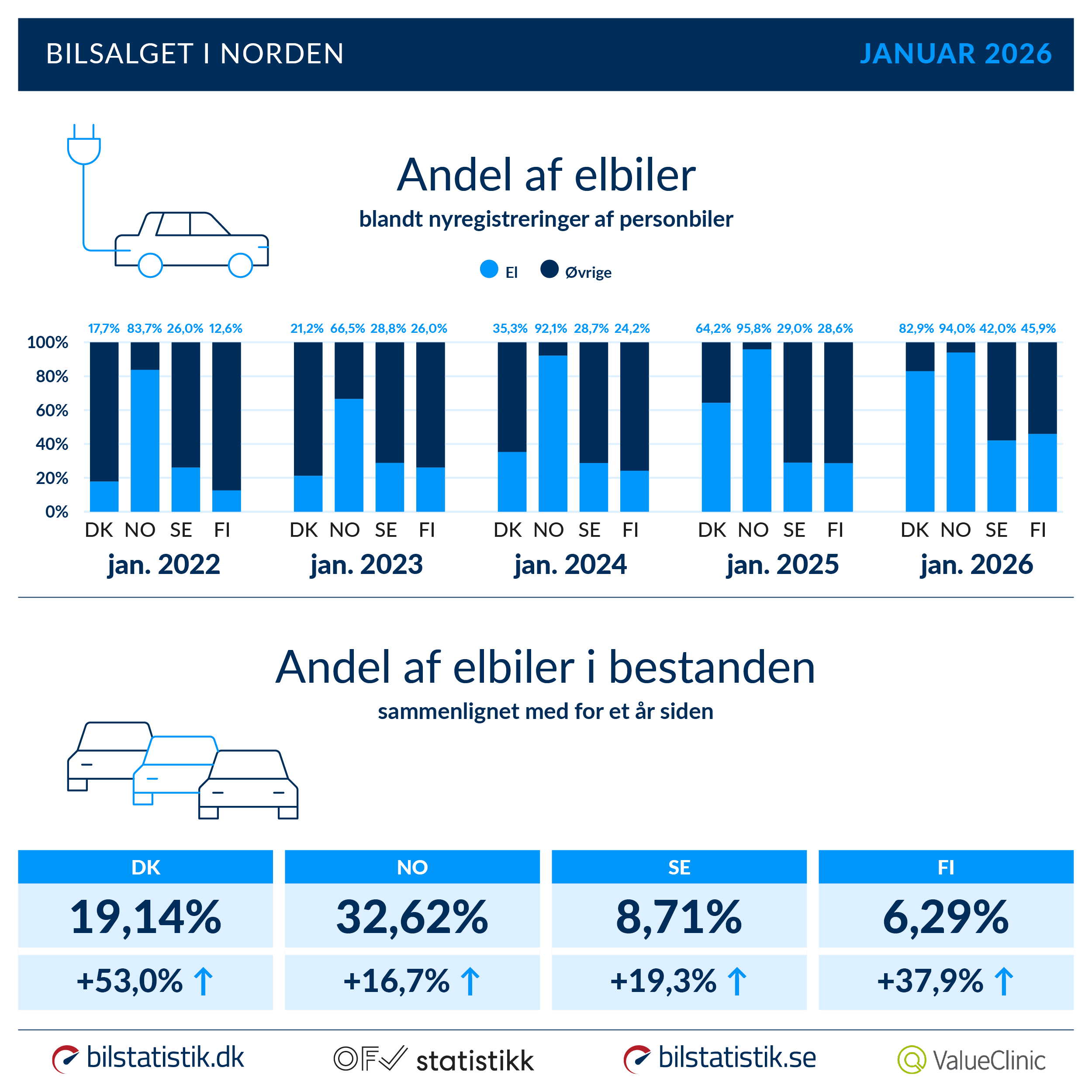Det nordiske bilsalg er kommet noget hostende fra start i 2026. Kun Danmark kom igennem januar med grønne tal, mens Finland, Sverige og især Norge blev sendt til tælling. Til gengæld gik det fremad for andelen af elbilregistreringer på alle markeder fraset ét - det norske.